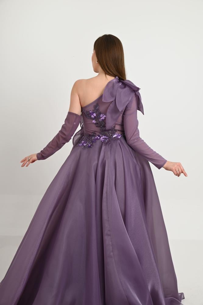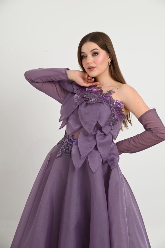اختاري التألق والجمال مع فستان بنفسجي طويل سهرة فاخر من بوتيك فساتين مودا بيلا. مصنوع من الأورجانزا الفاخر، يتميز بتفاصيل رائعة من الأزهار المزخرفة بالترتر، التي تضفي لمسة من الرقة والفخامة. يأتي الفستان بتصميم الكتف الواحد مع كم طويل شفاف، مما يمنحك إطلالة أنثوية راقية وأنيقة. تنورة التول الواسعة ذات قصة الكلوش تضيف لمسة أنثوية أنيقة تجعلك محط الأنظار في أي مناسبة.