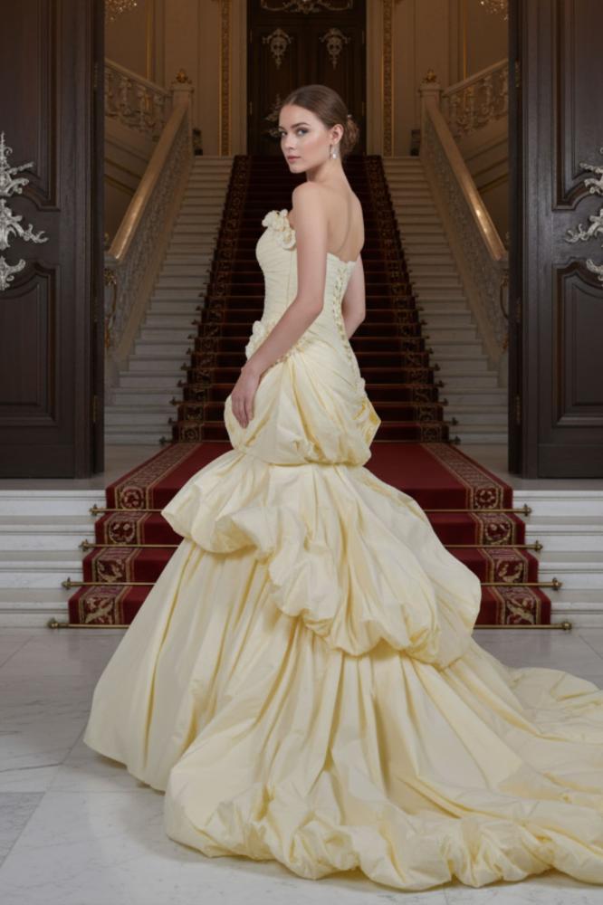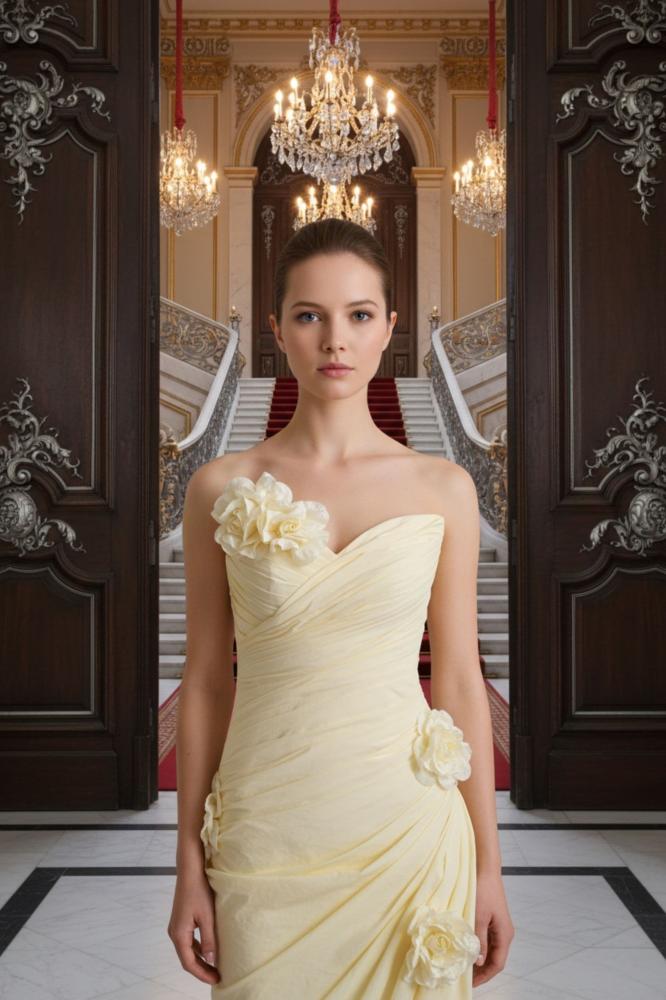 هذا الفستان الأصفر الفخم هو عنوان للتألق والجاذبية التي لا تُنسى.