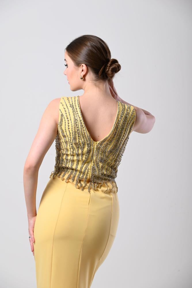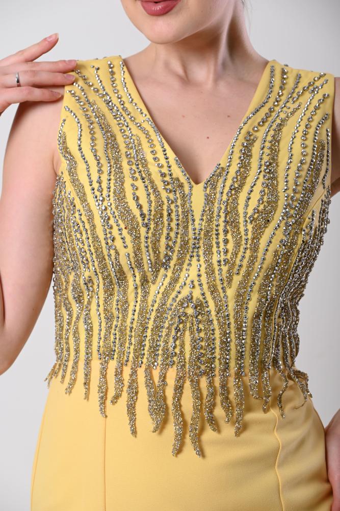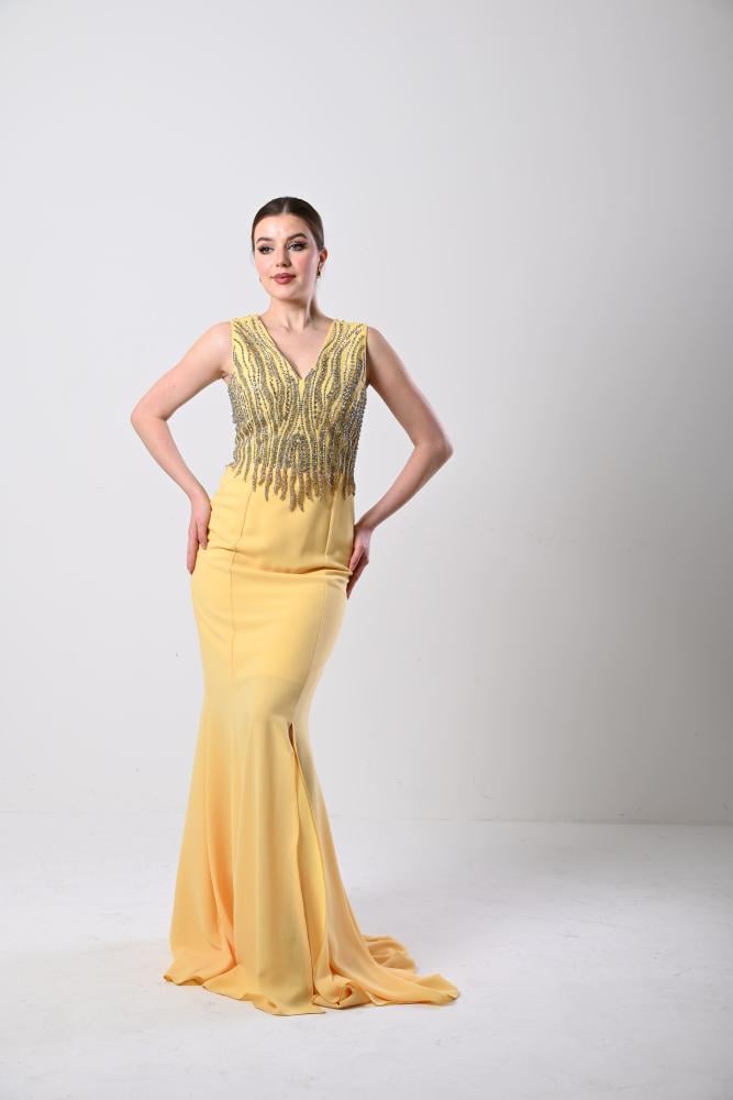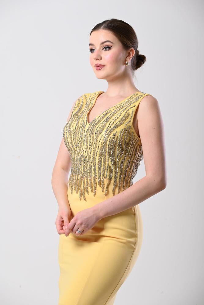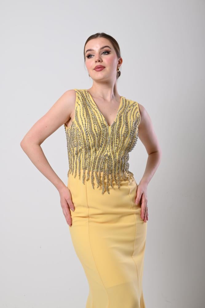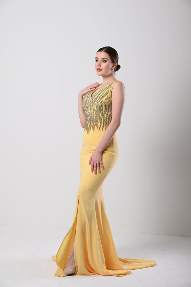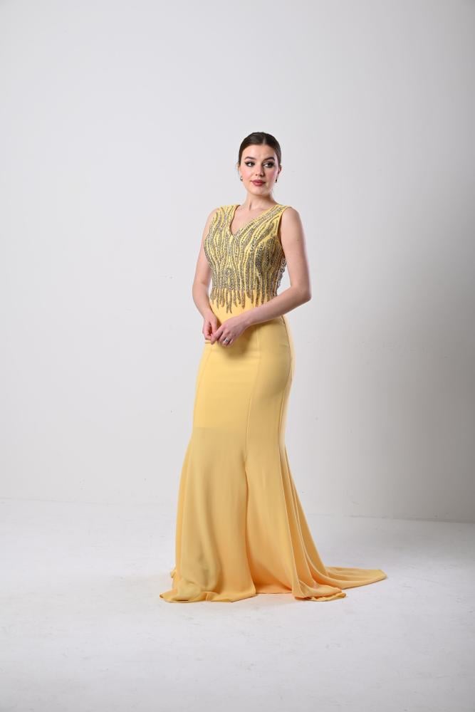 فستان سهرة أصفر شك الصدر قصة حورية