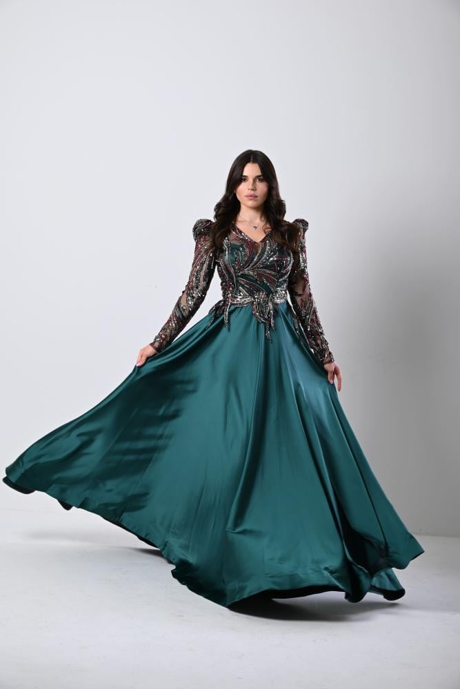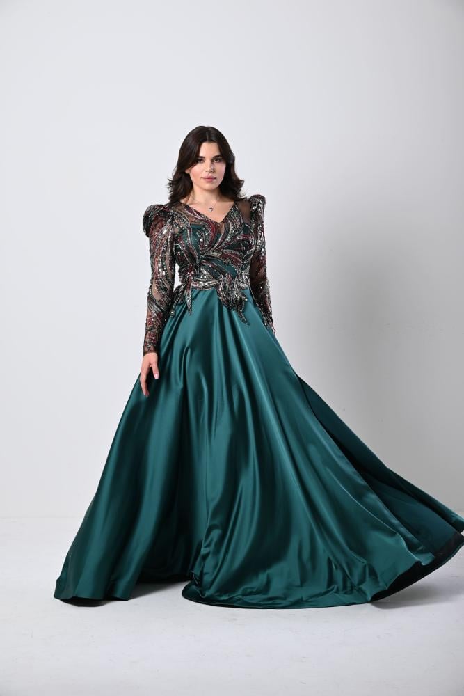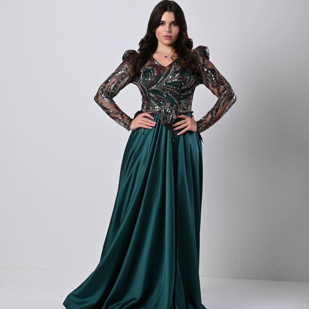 فستان سهرة زيتي شك الصدر والاكمام