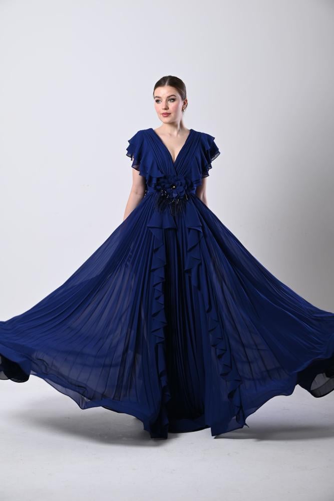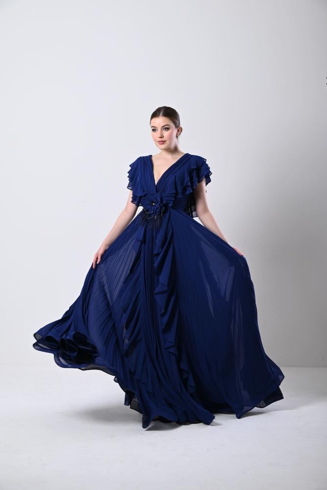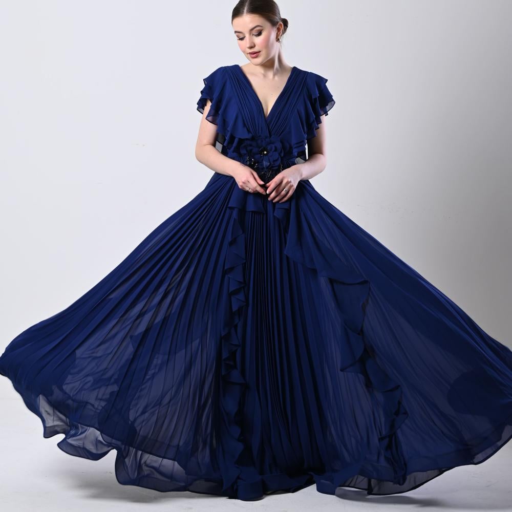 ارتدي الأناقة مع فستان سهرة شيفون كحلي من بوتيك فساتين مودا بيلا، تصميم راقٍ بأكمام متموجة وطيات ساحرة ليمنحك إطلالة ملكية تناسب مناسباتك الخاصة.