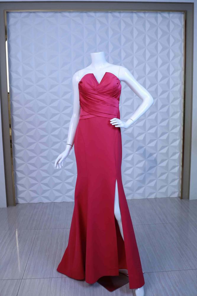 صُمم الفستان بقصة ضيقة تبرز جمال القوام، مع تفاصيل درابيه أنيقة على منطقة الصدر تضيف لمسة فنية راقية تعكس جمال التصميم.