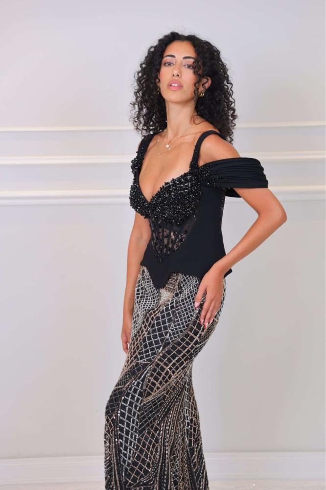 تألقي بفخامة ساحرة مع فستان السهرة الأسود المطرز من مودا بيلا بوتيك.
